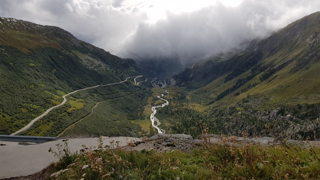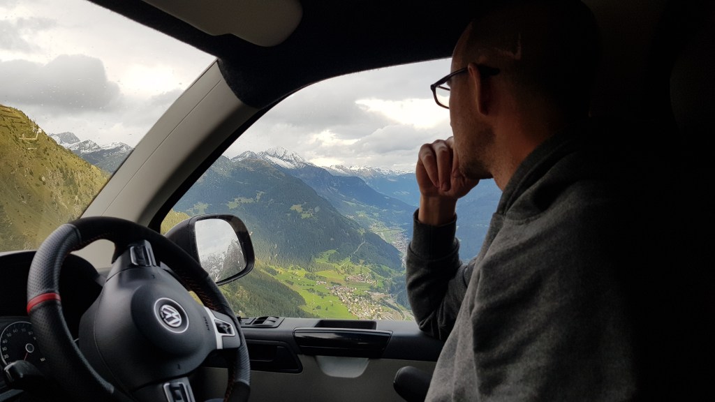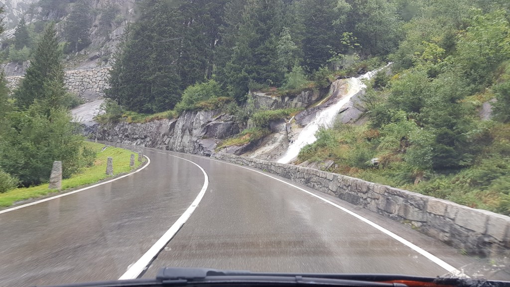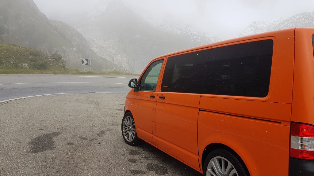 The first day saw Enid take us through hours of breathtaking scenery in the Swiss Alps (albeit in fog again, dammit!) before arriving at a small campsite in a village called Lauterbrunnen. Thankfully, there was a spot for us to park up, although it was by the skin of our teeth as the site was about to close, plus we had to rush back to the main village to get hard cash out so we could pay.